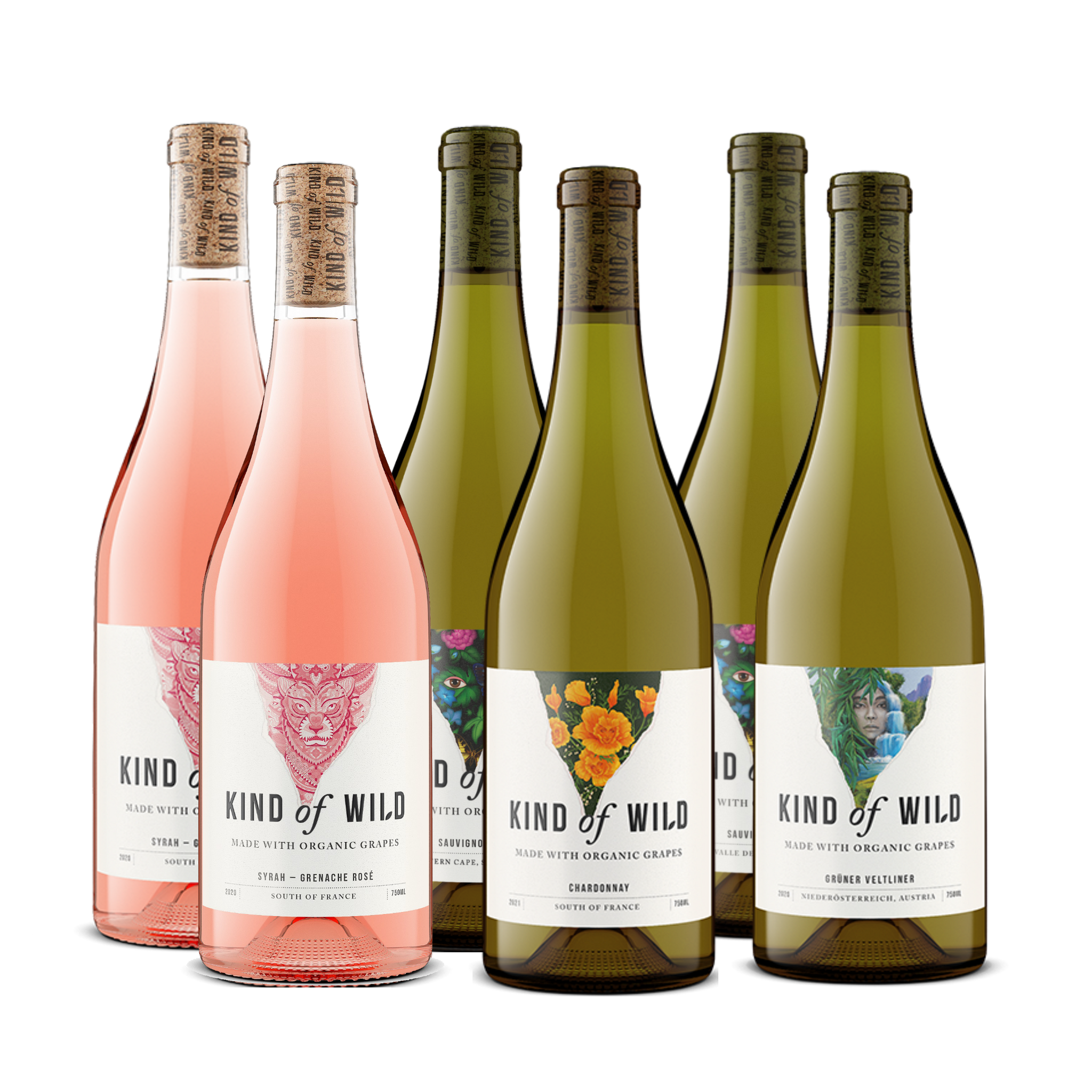 Mixed 6 pack with 2 bottles or rose and 4 whites from 3 different countries.